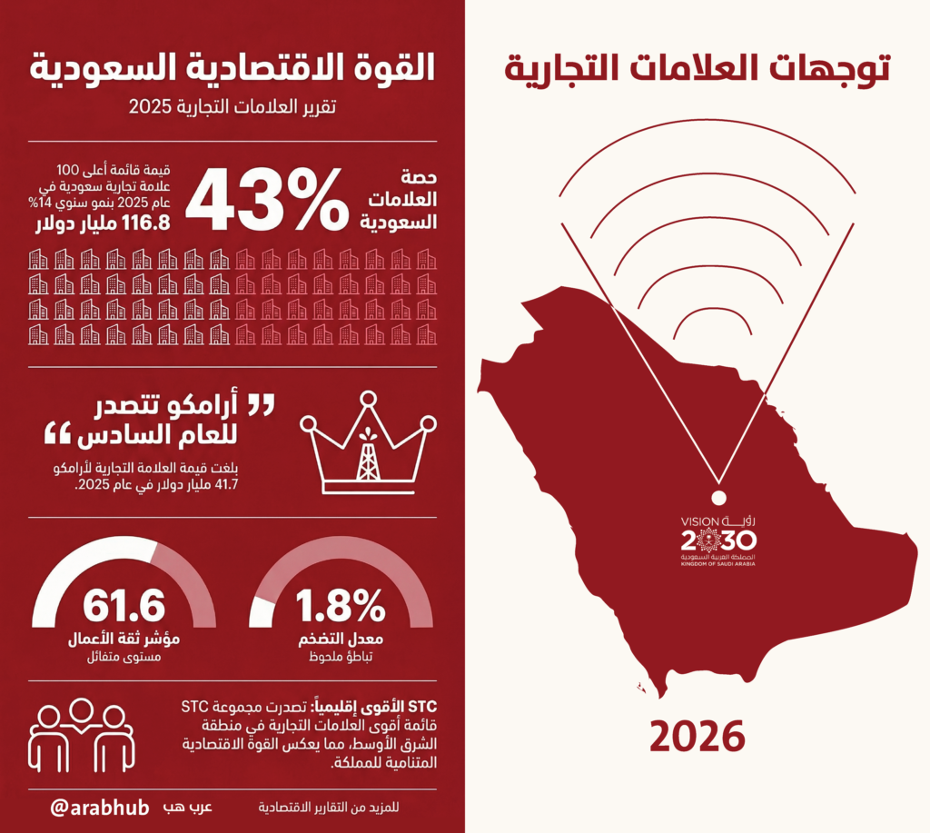- احتفظت شركة أرامكو السعودية بصدارة القائمة للعام السادس على التوالي بقيمة علامة تجارية بلغت 41.7 مليار دولار في 2025. المصدر